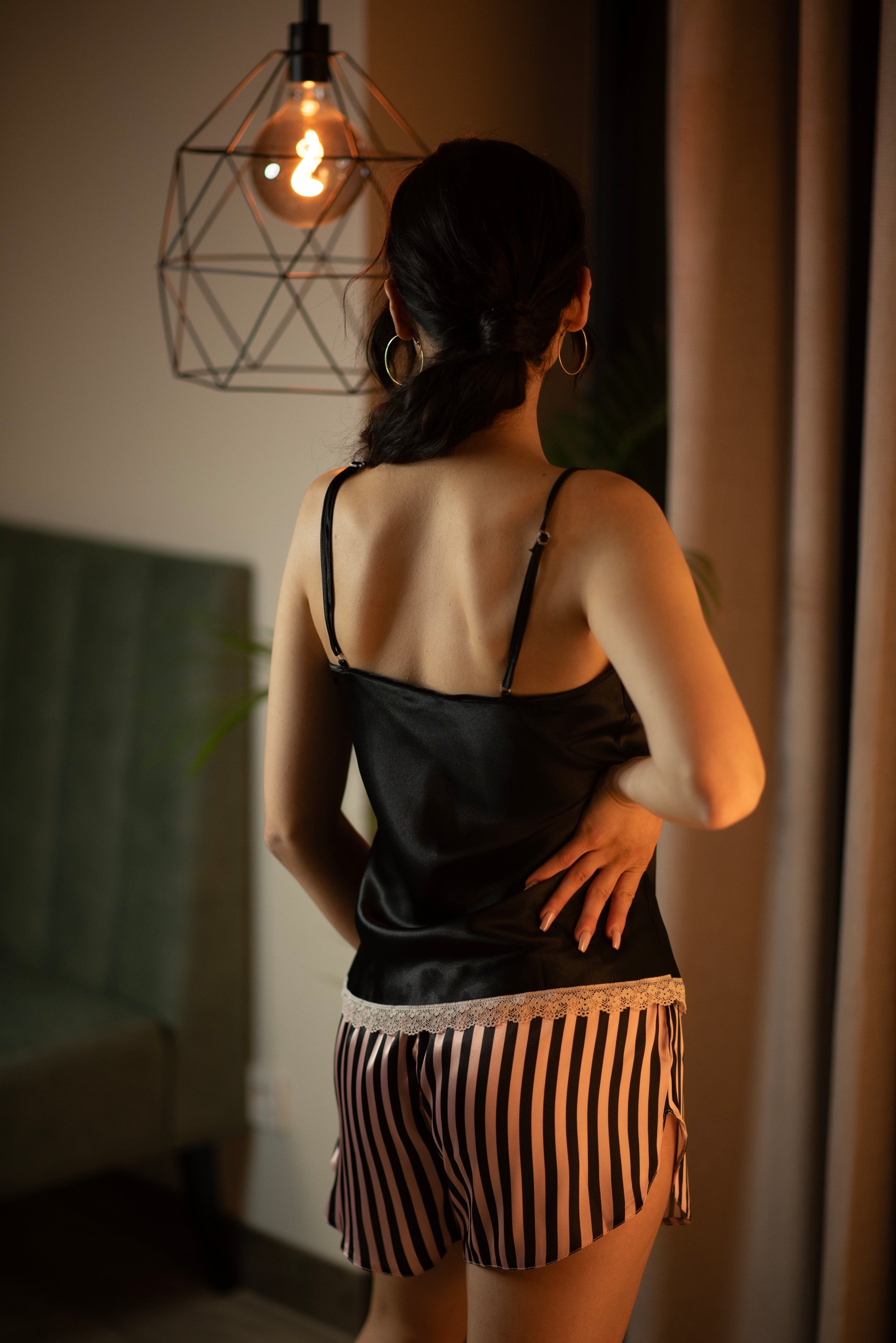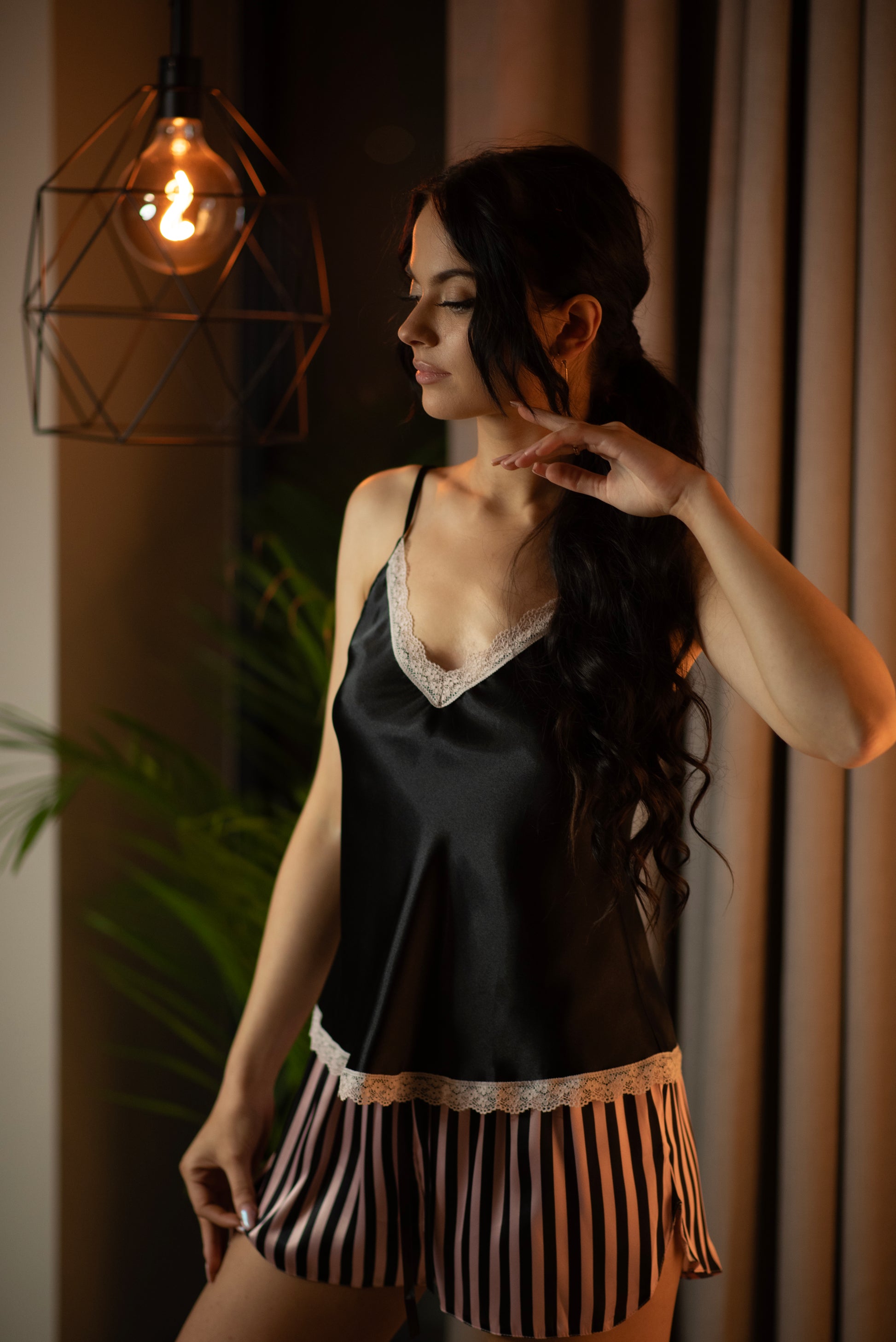 Šortukai yra dryžuoti, kuriuos sudaro juodos ir rožinės dryžuotos juostelės, suteikiantys pižamai žaismingumo ir jaunatviško žavesio. Tai puikus derinys.