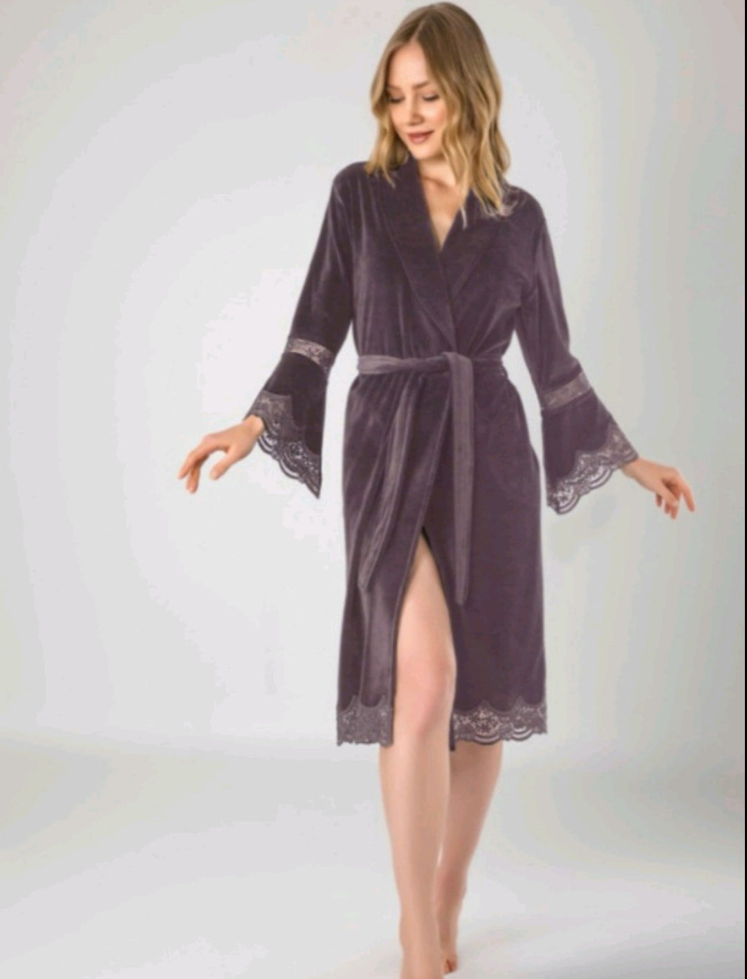 - Nėriniai: Elegantiški ir subtilūs nėrinukai puošia chalato rankogalius, apykaklę bei apačią, suteikdami jam išskirtinį ir rafinuotą išvaizdą.